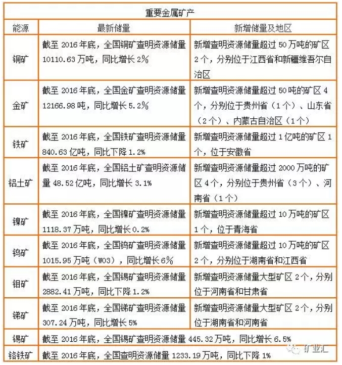 國土資源部提供的數(shù)據(jù)顯示,2016年,除鈾礦、稀土礦外,天然氣、煤層氣、鎢礦、錫礦、銻礦、金礦、磷礦、晶質(zhì)石墨等8種礦產(chǎn)查明資源儲量均有明顯增長;煤炭、石油、銅礦、鋁土礦、鎳礦、螢石6種礦產(chǎn)查明資源儲量小幅增長;鐵礦、鉻鐵礦、鈷礦、鉬礦、鋰礦、鋯礦、鉀鹽7種礦產(chǎn)查明資源儲量小幅下降;頁巖氣查明資源儲量有一定程度的下降。